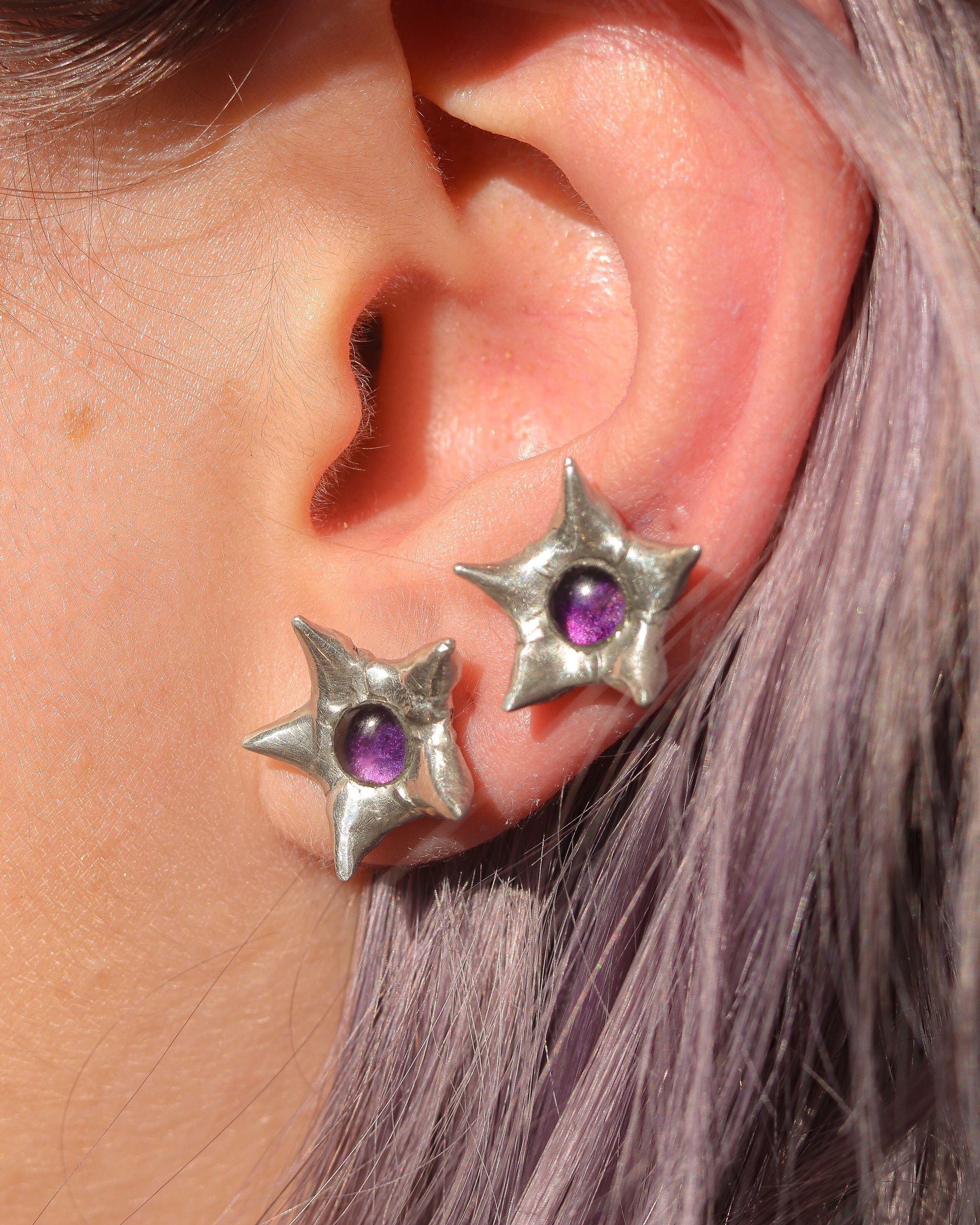 Handmade pair of star studs made with Amethyst gemstones and lead free jewelry solder. Earring posts are stainless steel (hypoallergenic, 316 surgical grade).