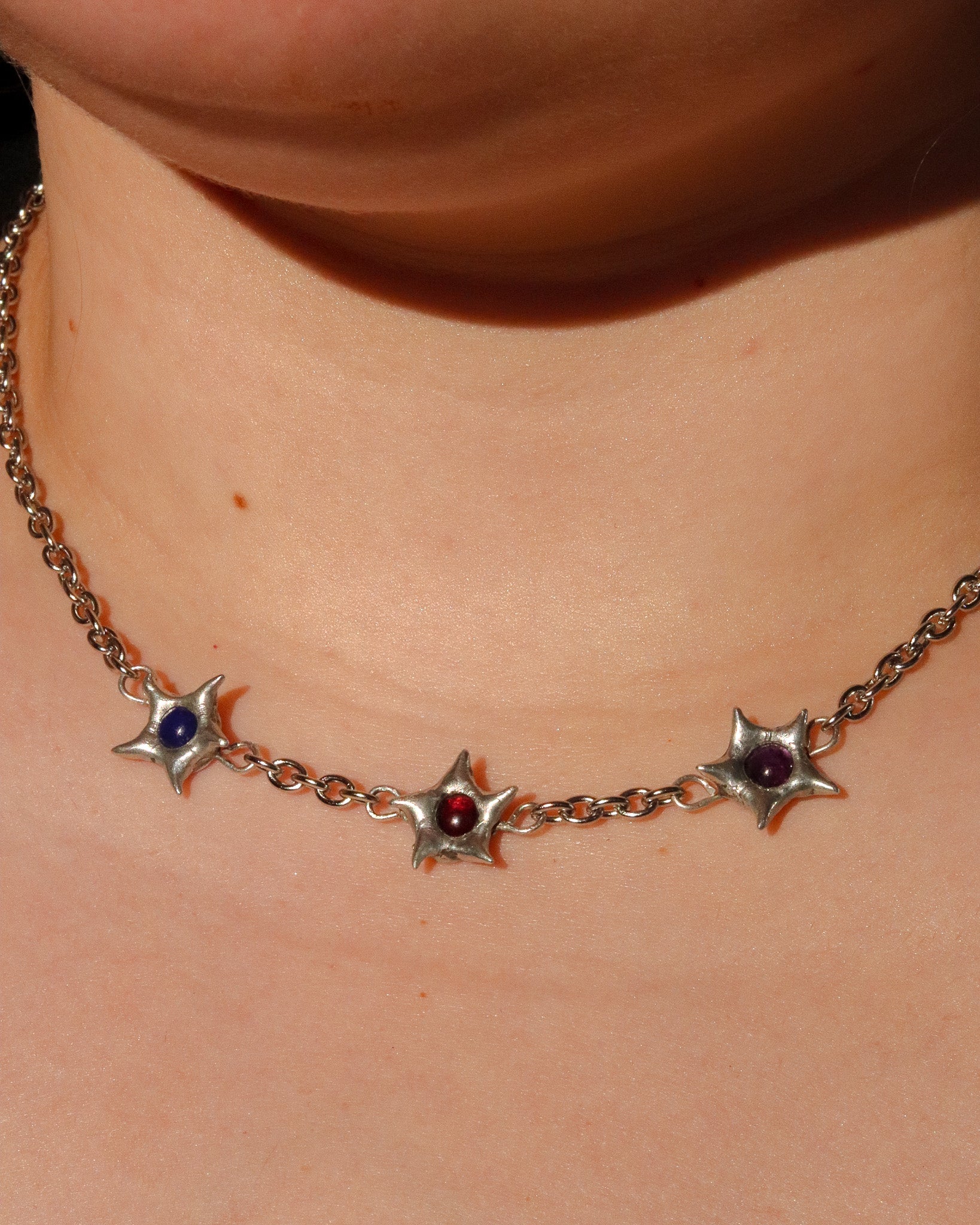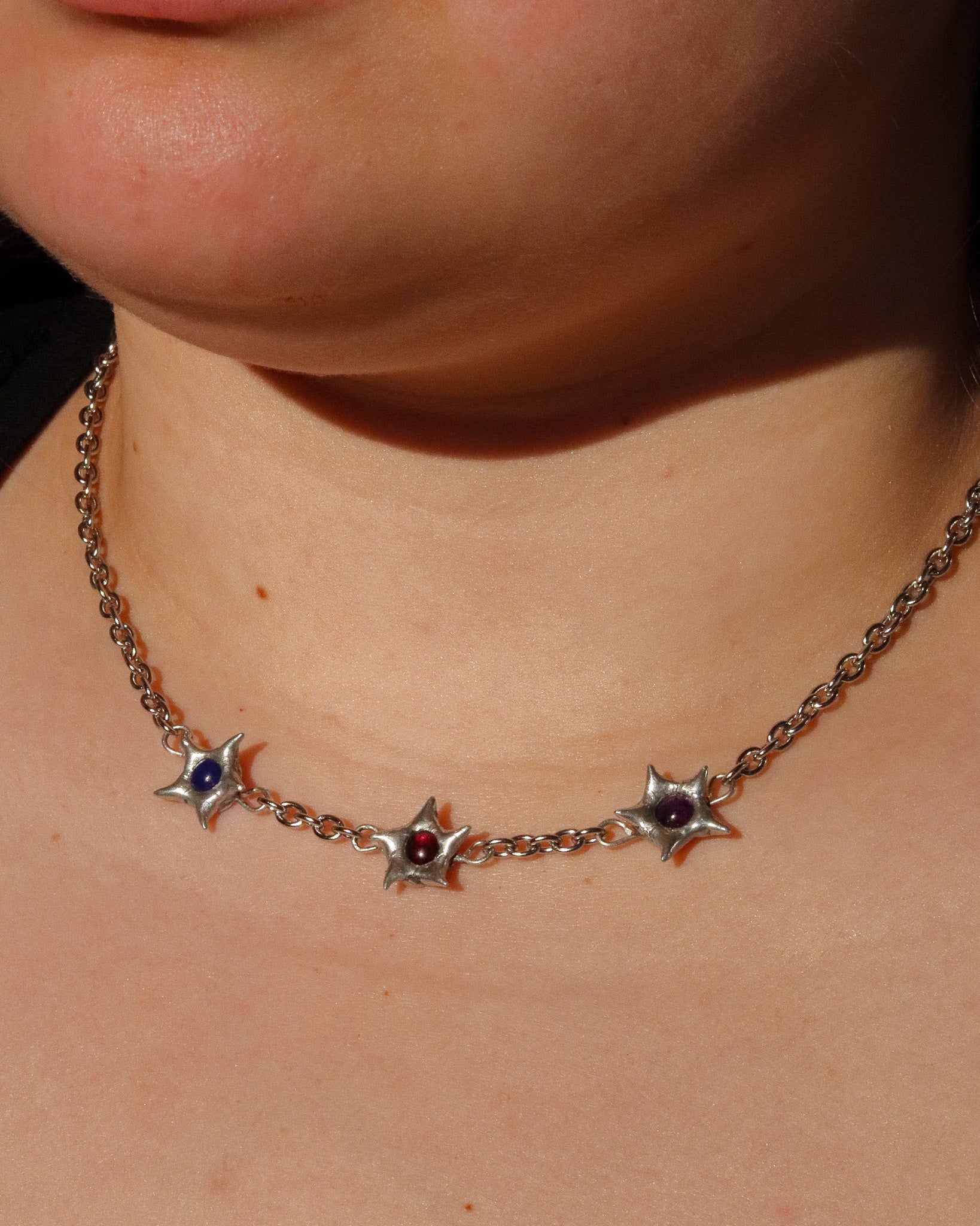 Handmade star necklace made with Lapis, Garnet, and Amethyst gemstones and lead free jewelry solder. Chain is stainless steel.
