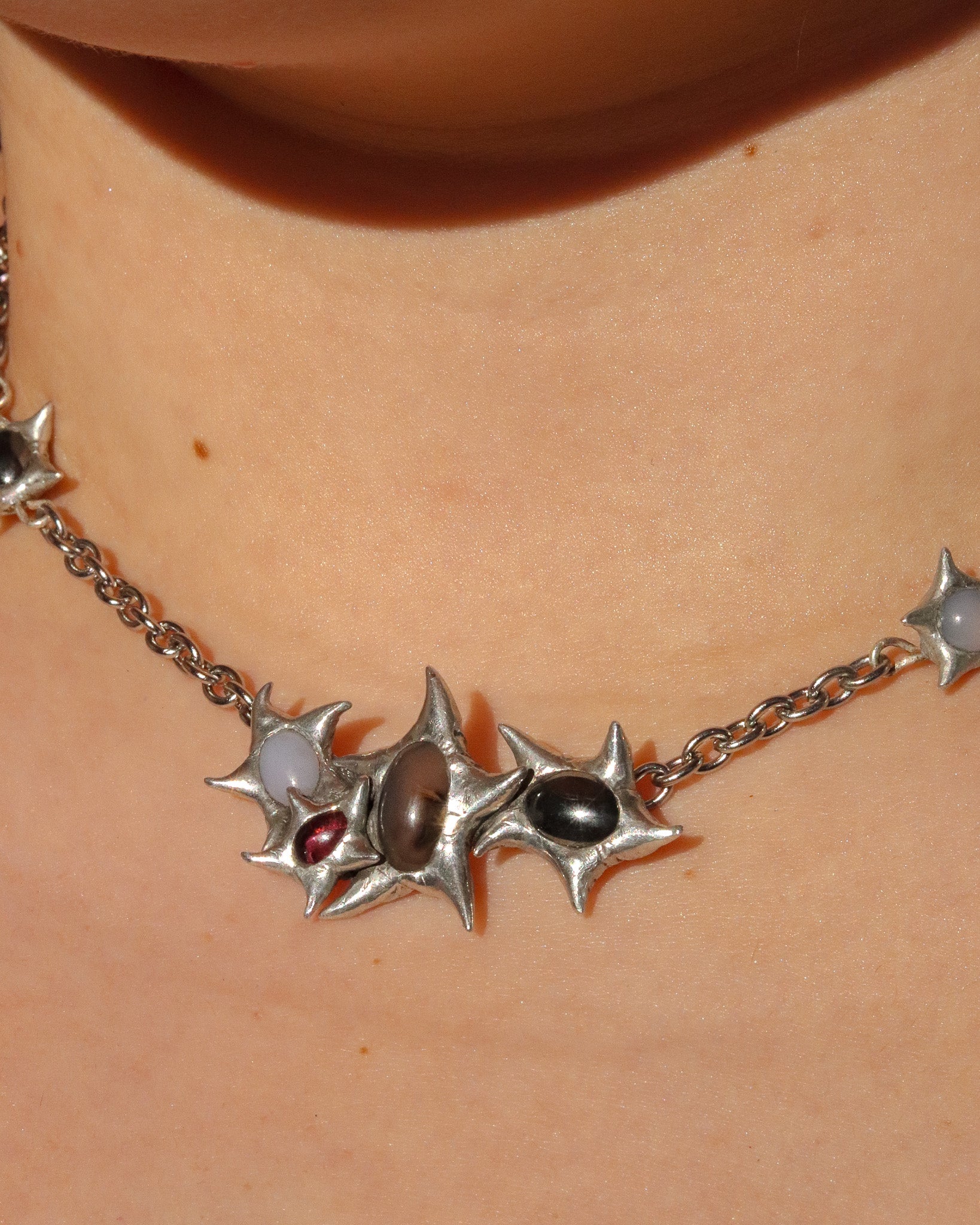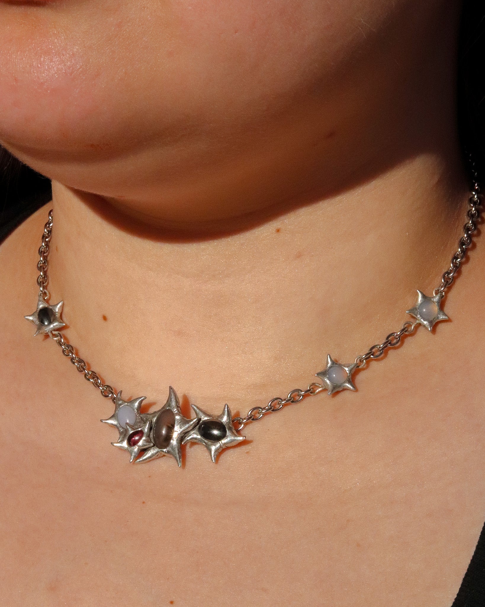 One of a kind, handmade star cluster necklace made with Emerald, Opal, and Citrine gemstones and lead free jewelry solder. Wire attached to the stars are sterling silver. Chain is stainless steel.